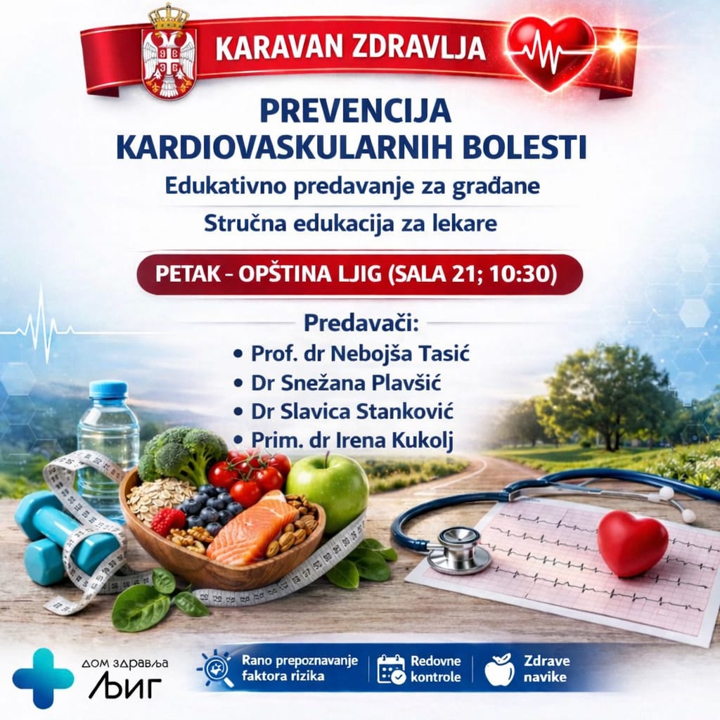 27. марта 2026. у згради Општине(сала 21) у 10:30ч, становници Љига биће домаћини „Каравана здравља”. Ова акција одвија се под покровитељством Владе Србије, Министарства здравља и ЗЗЈЗ Србије.Акцију води наш еминентни кардиолог, помоћник директора и управника Центра за едукацију и превенцију на Институту за кардиоваскуларне болести „Дедиње“, помоћник министра здравља у Влади Републике Србије, председник Светског удружења за васкуларно здравље и Удружења Центра за хипертензију, превенцију инфаркта и шлога, проф. др Небојша Тасић.