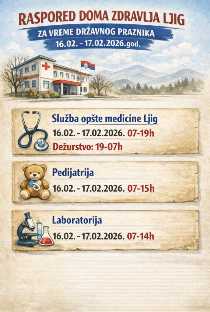 Обавештавамо кориснике здравствених услуга да ће током предстојећег државног празника, у понедељак 16. фебруара и уторак 17. фебруара 2026. године, службе Дома здравља Љиг радити по следећем распореду: